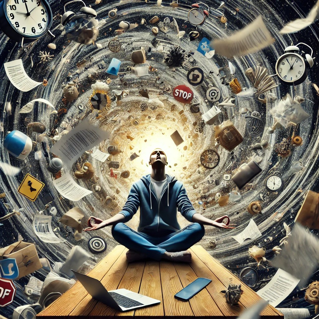 “Calmly meditating while chaos swirls around like Monday morning emails.”